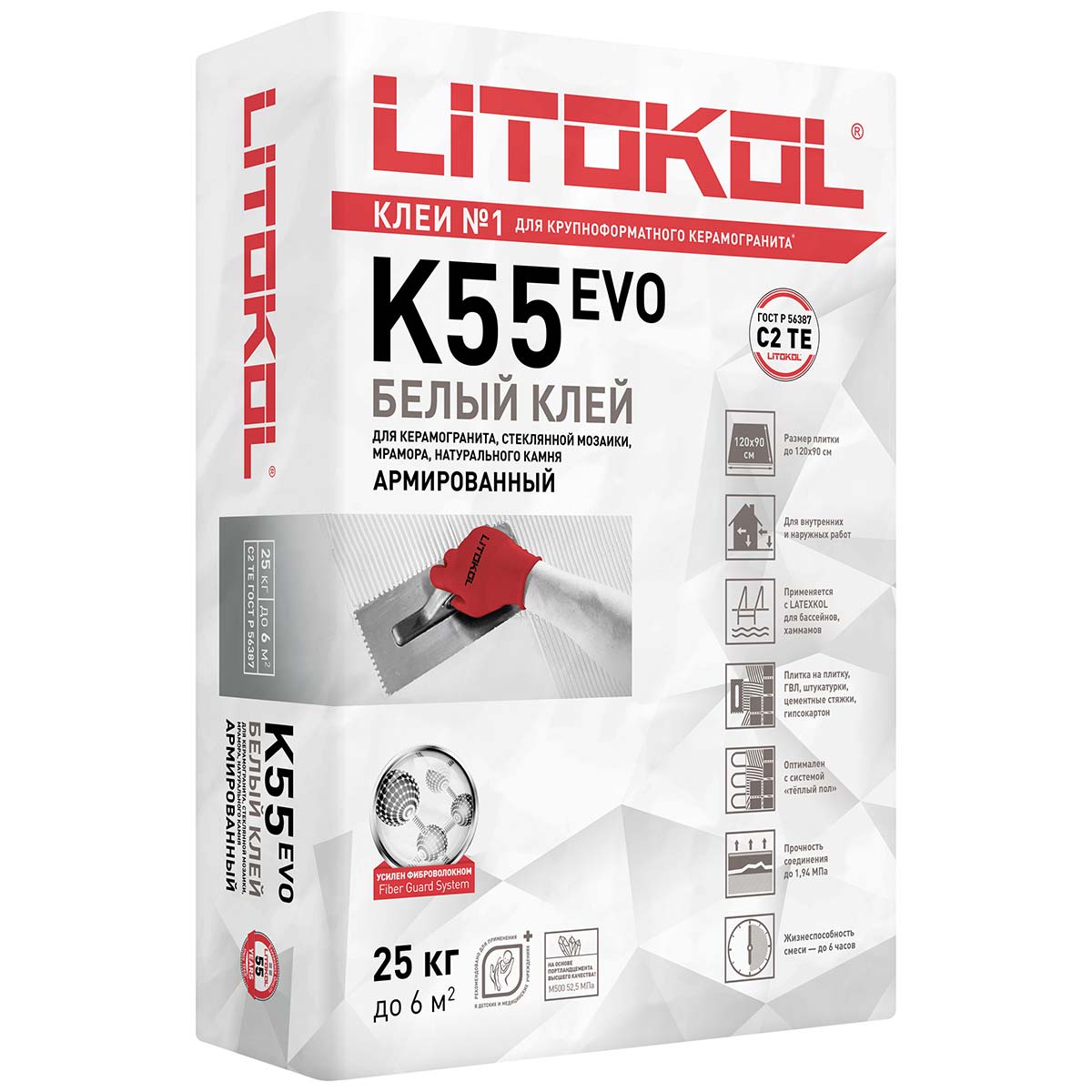 Клеевой состав для керамической плитки и мозаики LITOPLUS K55 можно применять для укладки мозаичного или керамического материала только при положительной температуре окружающего воздуха– не ниже +5С и не выше +35С. Важным преимуществом является длительное время использования приготовленной смеси – около 8 часов, что выгодно отличает этот продукт от аналогичных предложений на рынке. Для облицовки поверхностей, подверженных вибрационных нагрузкам, или оснований большой площади необходимо использовать специальную добавку LATEXKOL-m в соответствующих пропорциях, указанных в инструкции. Во влажных помещениях предварительно должна быть выполнена гидроизоляция. А гипсолитовые и гипсовые поверхности необходимо предварительно тщательно прогрунтовать грунтовкой PRIMER C-м и дождаться полного высыхания основания.