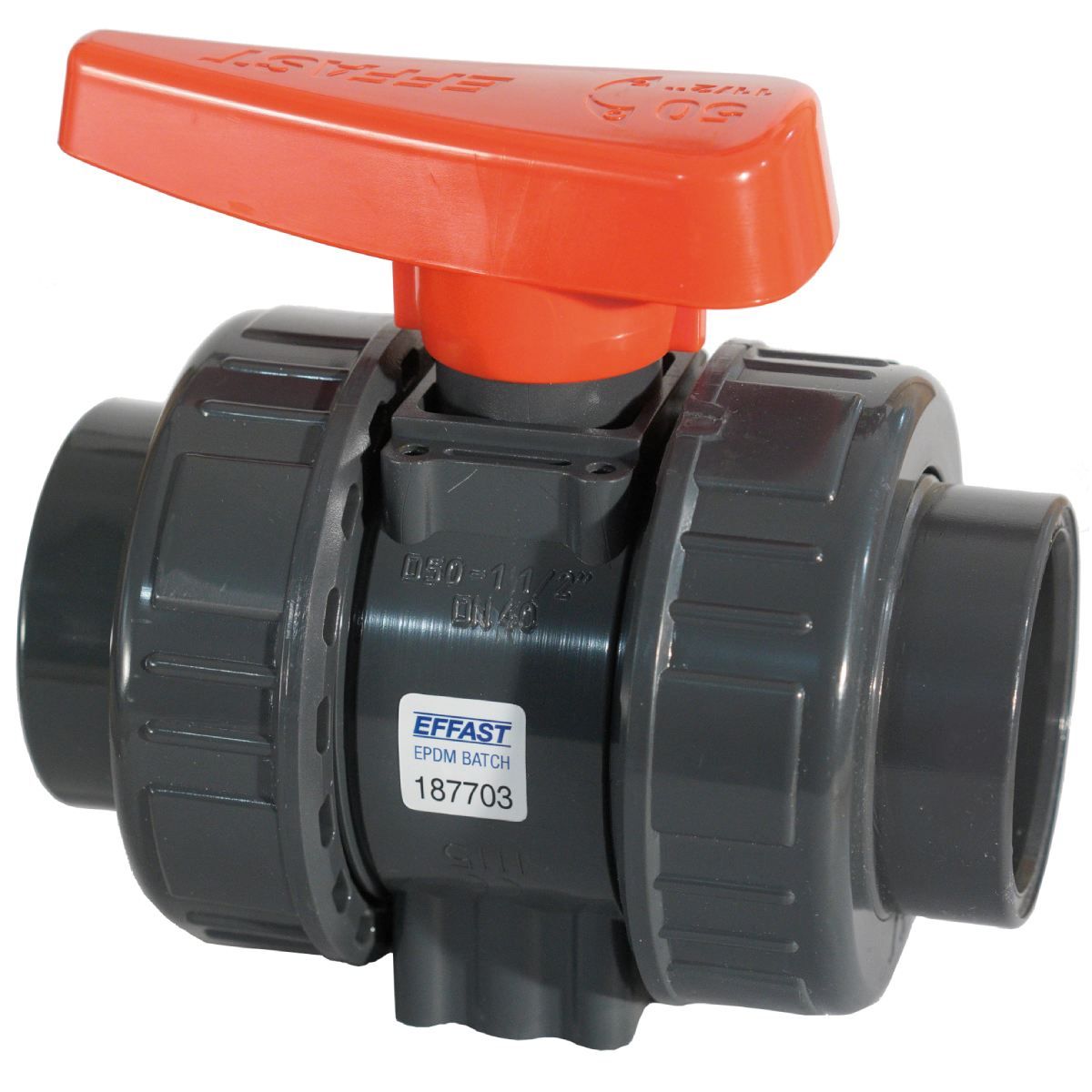 Промышленный шаровый кран Effast BDRBK1D0320 серии "BK1" с муфтовым окончанием из непластифицированного поливинилхлорида PVC-U. Уплотнением из EPDM. Производство Италия.