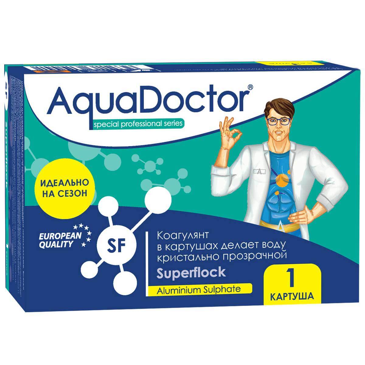 Основу препарата AquaDoctor Superflock составляет сульфат алюминия (Aluminium Sulfate). Вещество не восприимчиво к термическим условиям среды, благодаря чему активно воздействует на взвешенные частицы находящиеся в воде, образуя на них хлопьевидный осадок. В результате частицы не только увеличивают свой размер, но также и вес. Самые мелкие из них подвергаются загустению и остаются в толще воды, крупные – оседают на дно. Кроме того, процесс коагуляции усиливает действие дезинфицирующих средств, применяемых в бассейне. Производимая реакция повышает эффективность процедуры очистки бассейна.